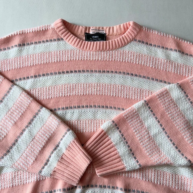 size 肩幅63.5cm 身幅67cm 着丈62cm ・ model:167cm ・ ピンクベースに白×グレーボーダー ・ 春に相応しい素敵配色◎◎ 所々織りで切り替わる生地も秀逸◎◎ ・ 流石はsearsな1着です! ・ 幅はワイド、丈はコンパクトなバランスも完璧◎◎ ・ コットンニットお探しの方々是非