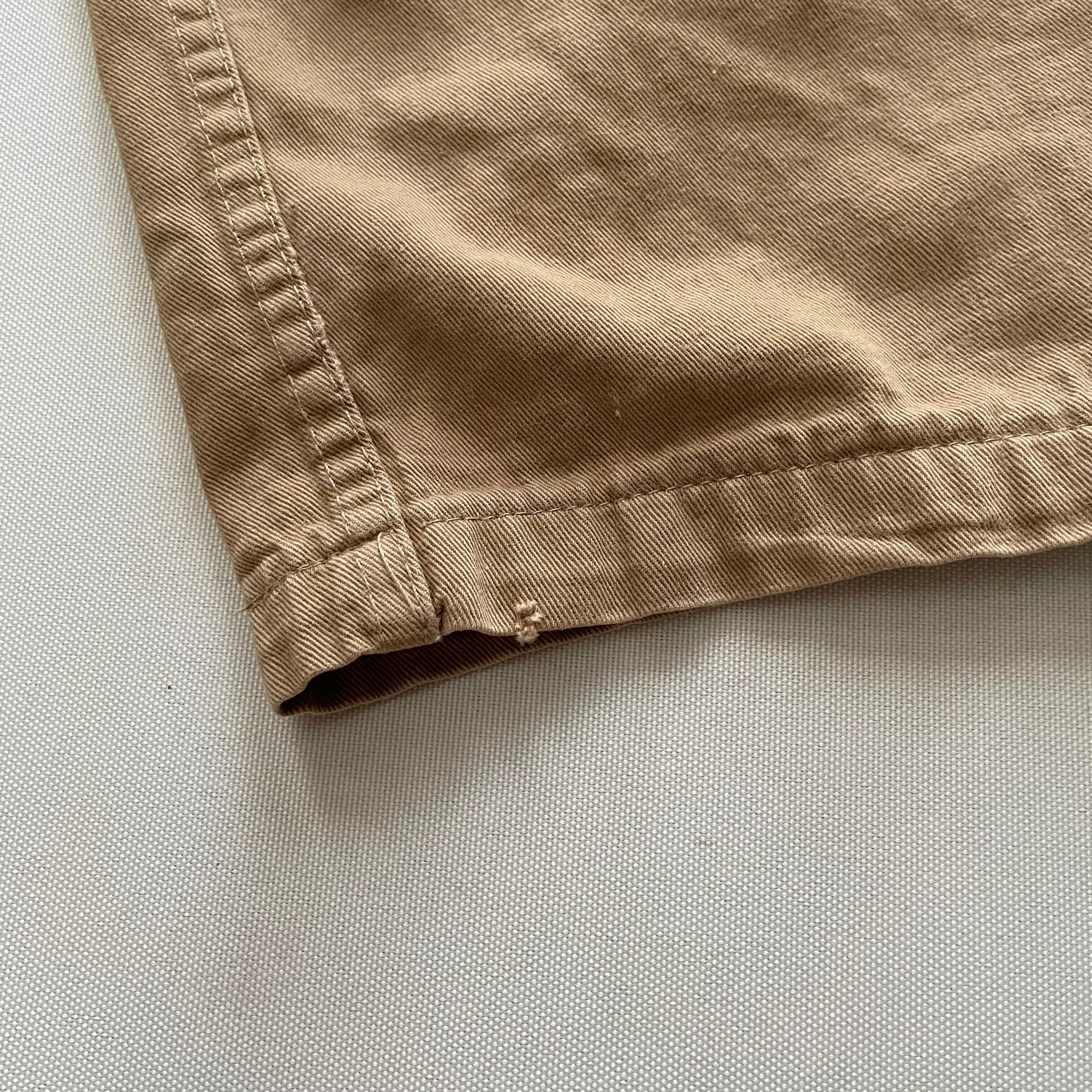 右ポケット縁部分・背面右裾部分にダメージ、左ふくらはぎ部分に薄い汚れがあります。(画像10~12枚目)