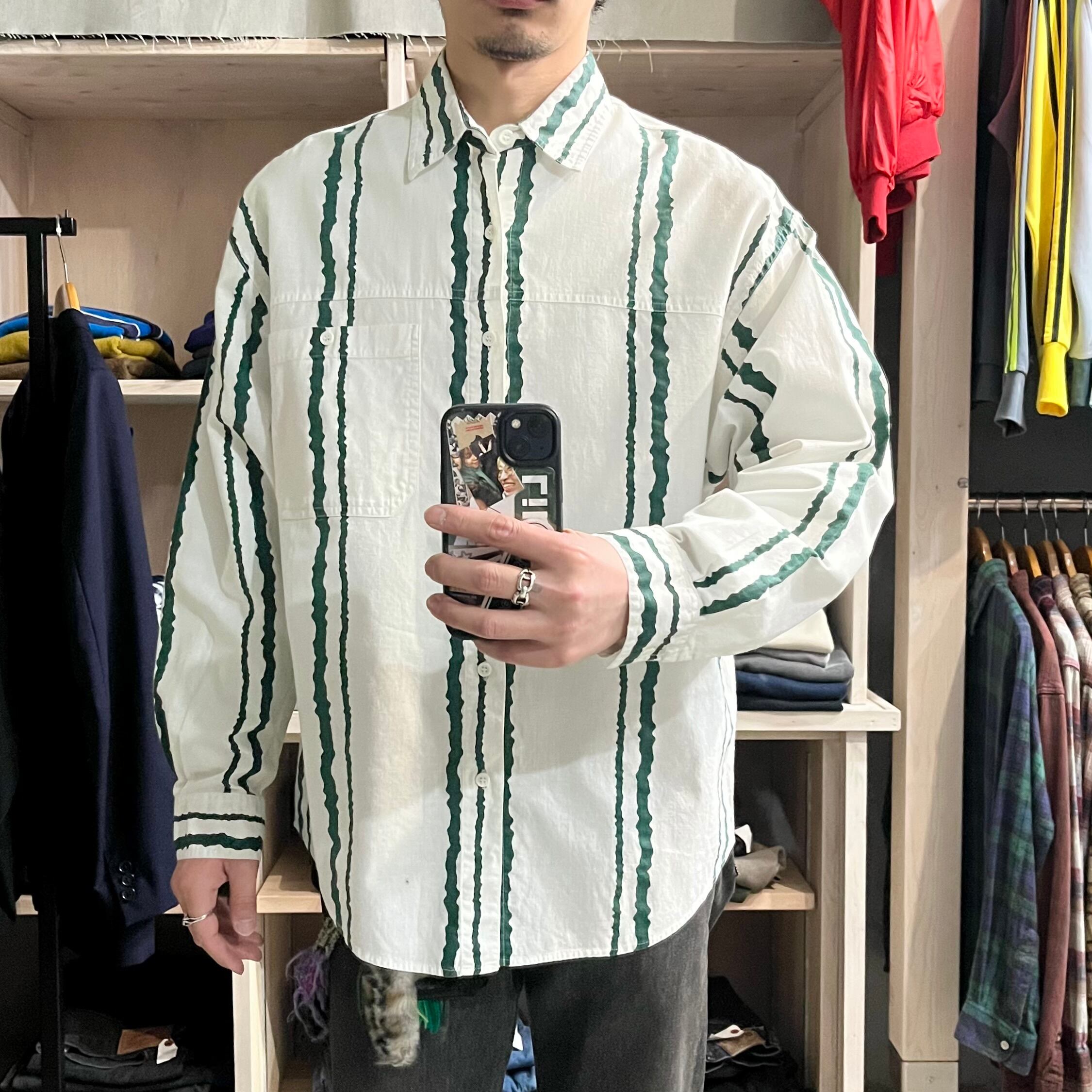 ホワイトカラーベースにグリーンカラーのストライプシャツ!!